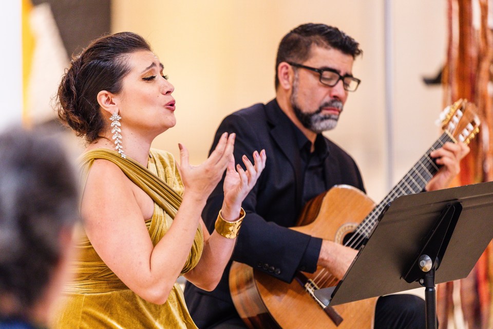 Soprano Catalina Cuervo provided the evening’s emotional core. In Britten’s “Embroidery Aria” from Peter Grimes, she traced Ellen Orford’s sorrow with poignant intimacy, her voice carrying both fragility and strength. The atmosphere shifted with Villa-Lobos’s Melodía Sentimental, which evoked tropical warmth akin to de Amaral’s radiant color palette, then Cuervo unleashed fiery passion in María Grever’s Júrame. In Glass’s “Hymn to the Sun” from Akhnaten, Cuervo’s voice soared with radiant clarity, perfectly matched by Johnson’s steady, glowing accompaniment. Together, they created one of the evening’s most transcendent moments.